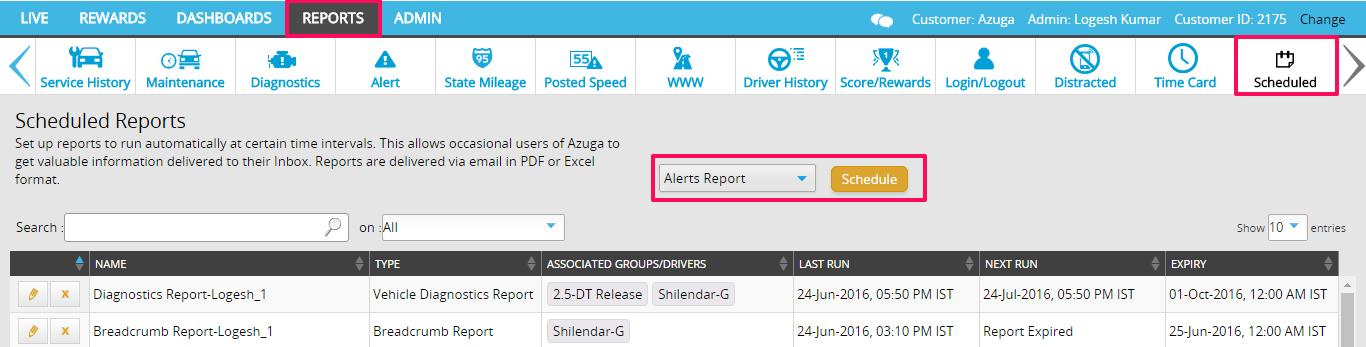3. Select Alerts Report from the drop down list and click on the Schedule button.