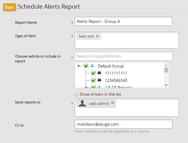 a. Enter a name for the report in the Report Name text box.b. Select the type of alert as Seat Belt.c. Select groups/vehicles that are to be included in this report.d. Select the names of users/drivers to whom you wish to send this report.e. Enter CC addresses if any.