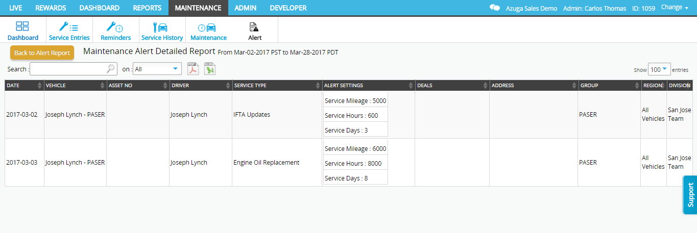 A Maintenance Alert Report provides summarized information about all the Maintenance reminders and Deals that have triggered on each alert across your fleet.