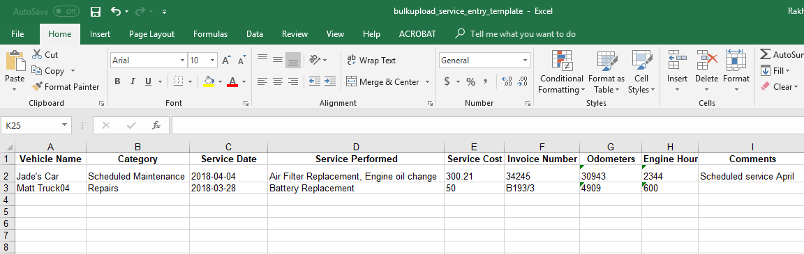 6. Enter the details of the service records in the spreadsheet. Ensure that you input the details in the correct format.