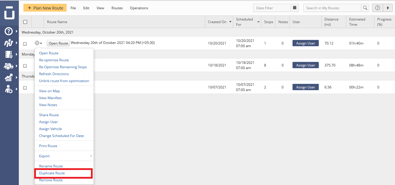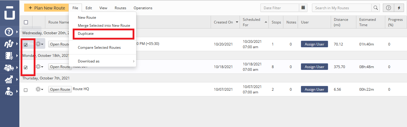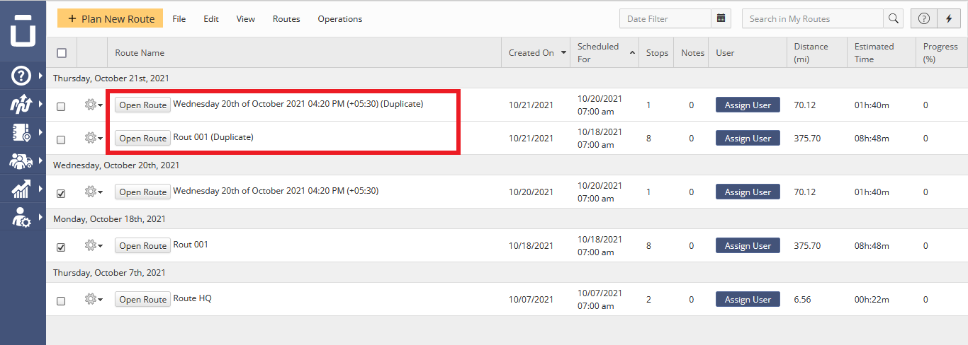 NOTE: When you duplicate a route, all the origin addresses and destinations from this route are cloned into the duplicated route. If the route has a user assigned to it, the duplicated route will be assigned to the same user.